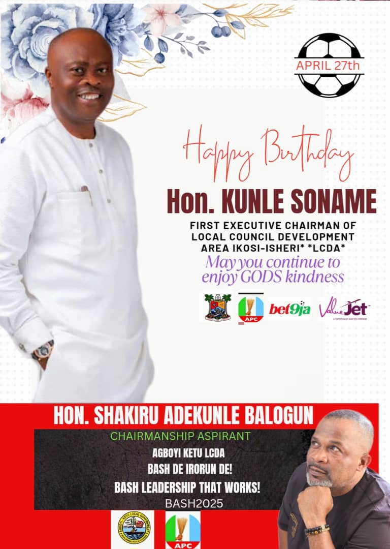 Chairmanship aspirant for Agboyi-Ketu Local Council Development Area (LCDA), Hon. Shakiru Balogun, has extended warm birthday wishes to Hon. Kunle Soname, describing him as a “great and humble leader” whose dedication and integrity continue to inspire many.